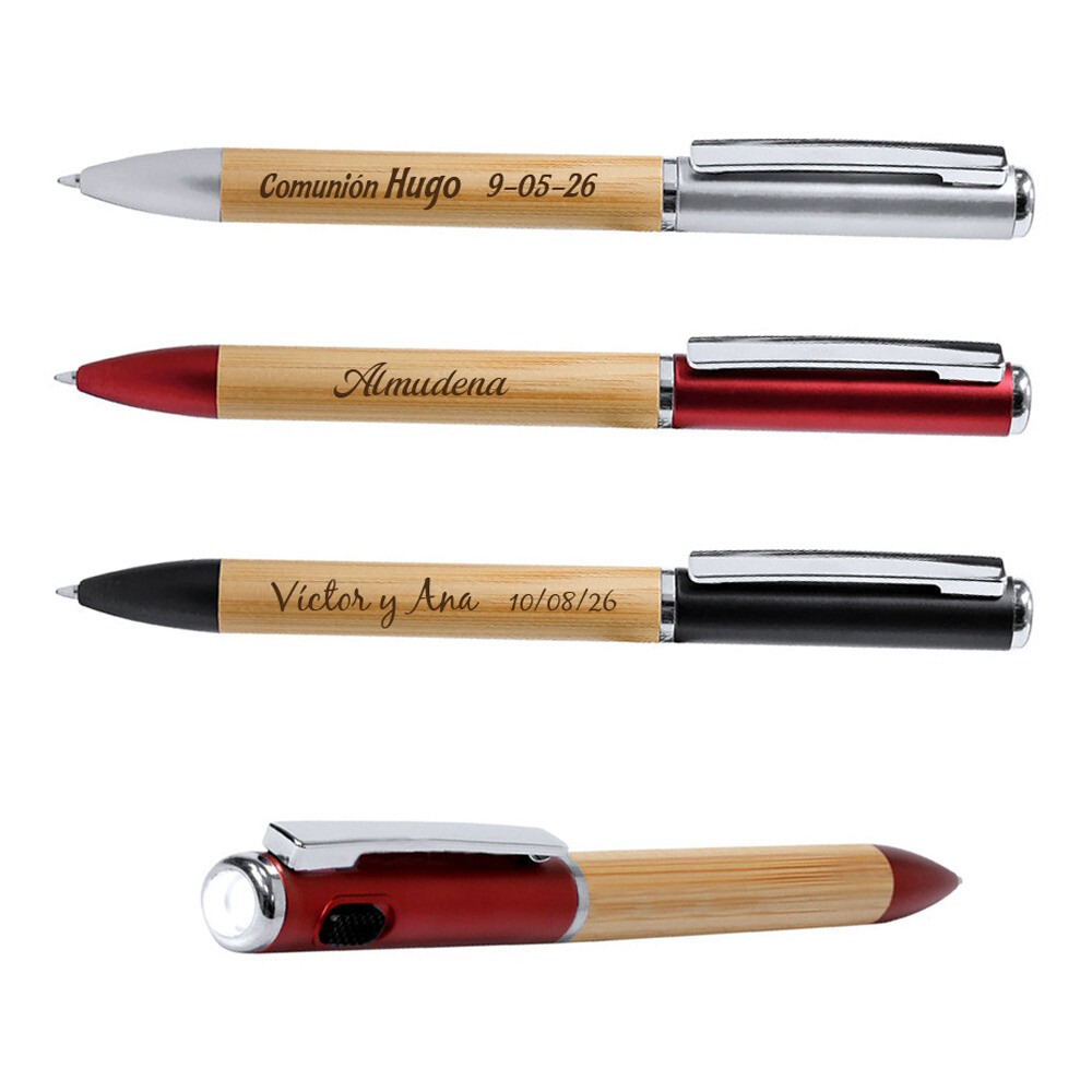 Bolígrafo con linterna LED integrada fabricado en bambú natural, ideal como detalle original y práctico para invitados de boda, comunión o bautizo.