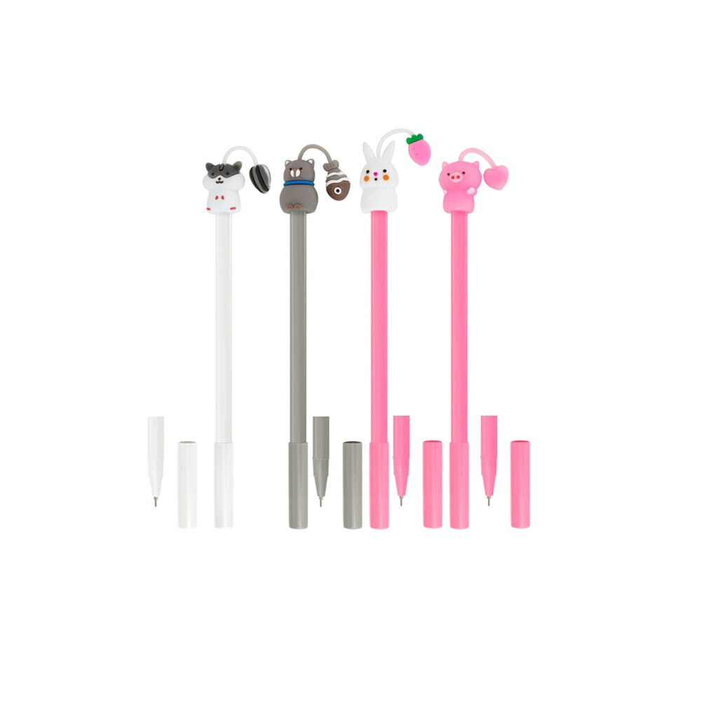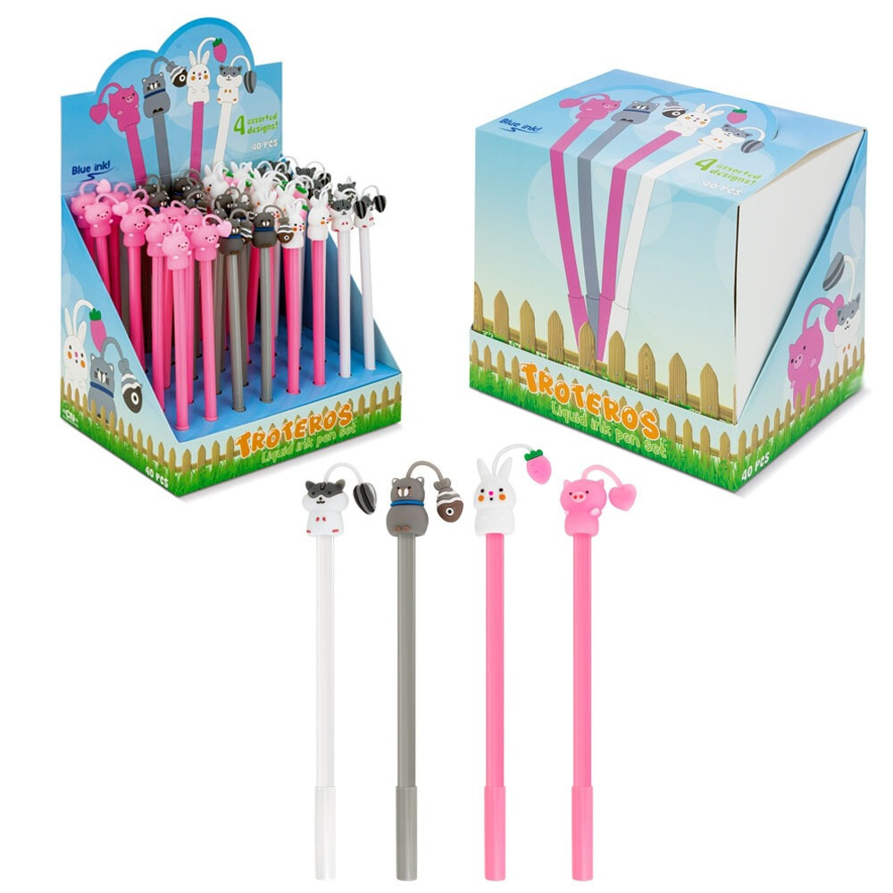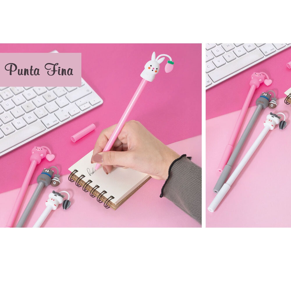Bolígrafo de goma con un animal en la punta y un objeto que se mueve lo que lo hace divertido, por ejemplo el conejo lleva una zanahoria.
