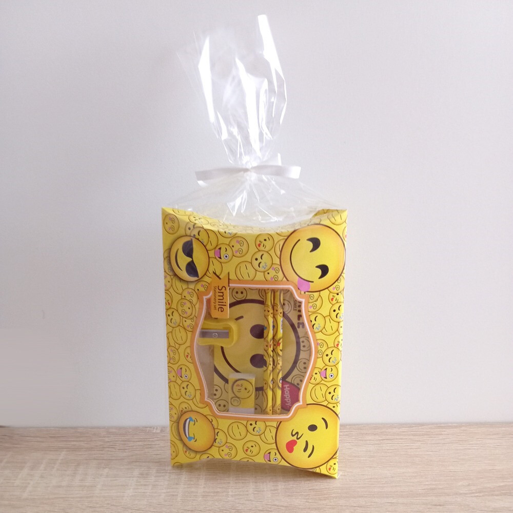 Estuche grande con accesorios de escritura infantil con dibujos de caras de emojis o emoticonos.