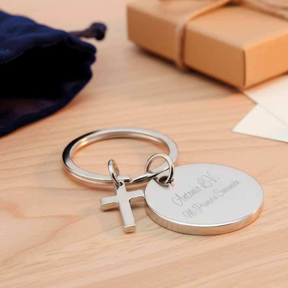 Elegante llavero metálico en acabado plateado con diseño redondo y cruz colgante, ideal como detalle para invitados en comuniones, bautizos y celebraciones religiosas.