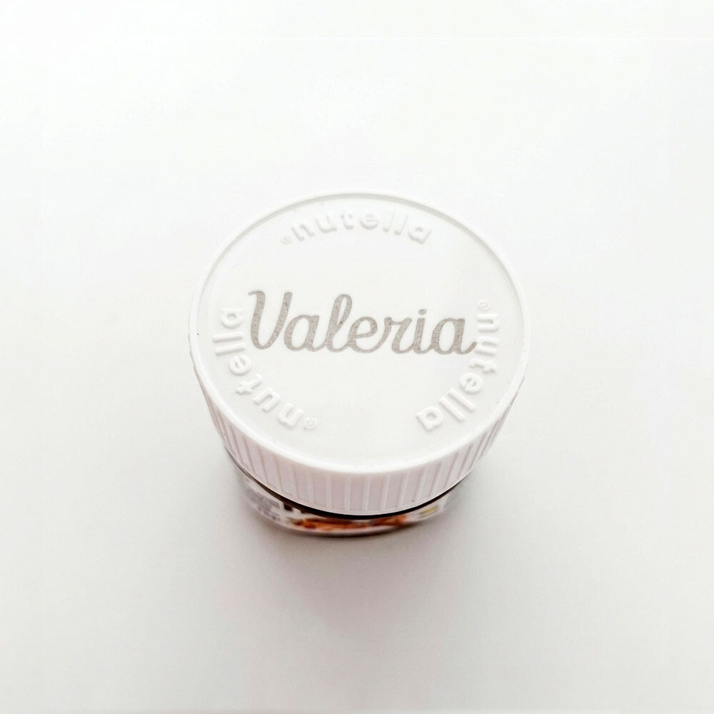 Su práctico tarrito de cristal contiene la deliciosa crema de cacao Nutella y se personaliza en la tapa mediante grabado láser, creando un recuerdo único y elegante para tus invitados.