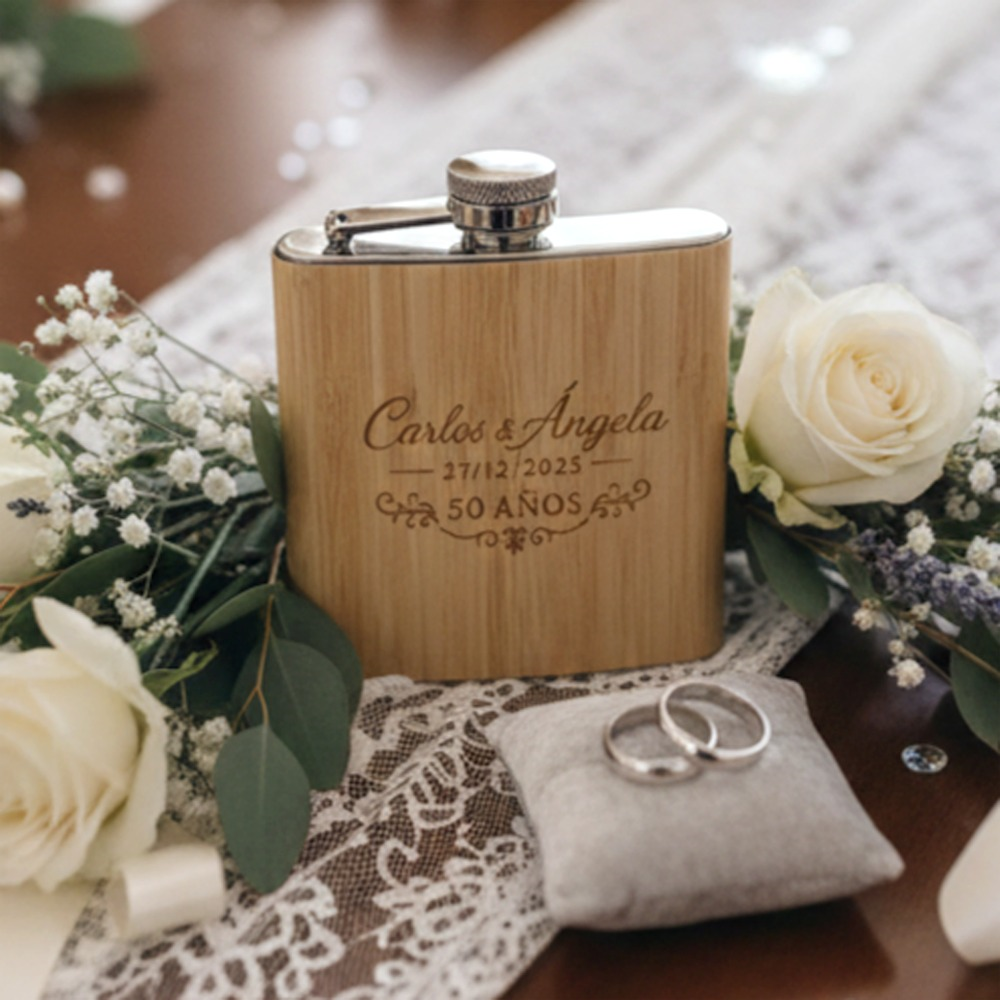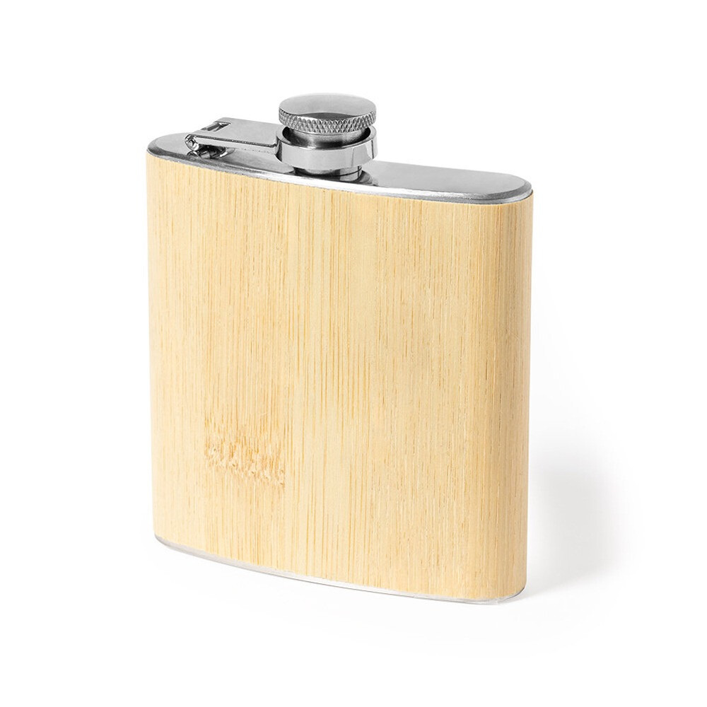 Petaca con exterior en bambú de suave acabado, con cuerpo de acero inoxidable y tapón de seguridad a rosca.