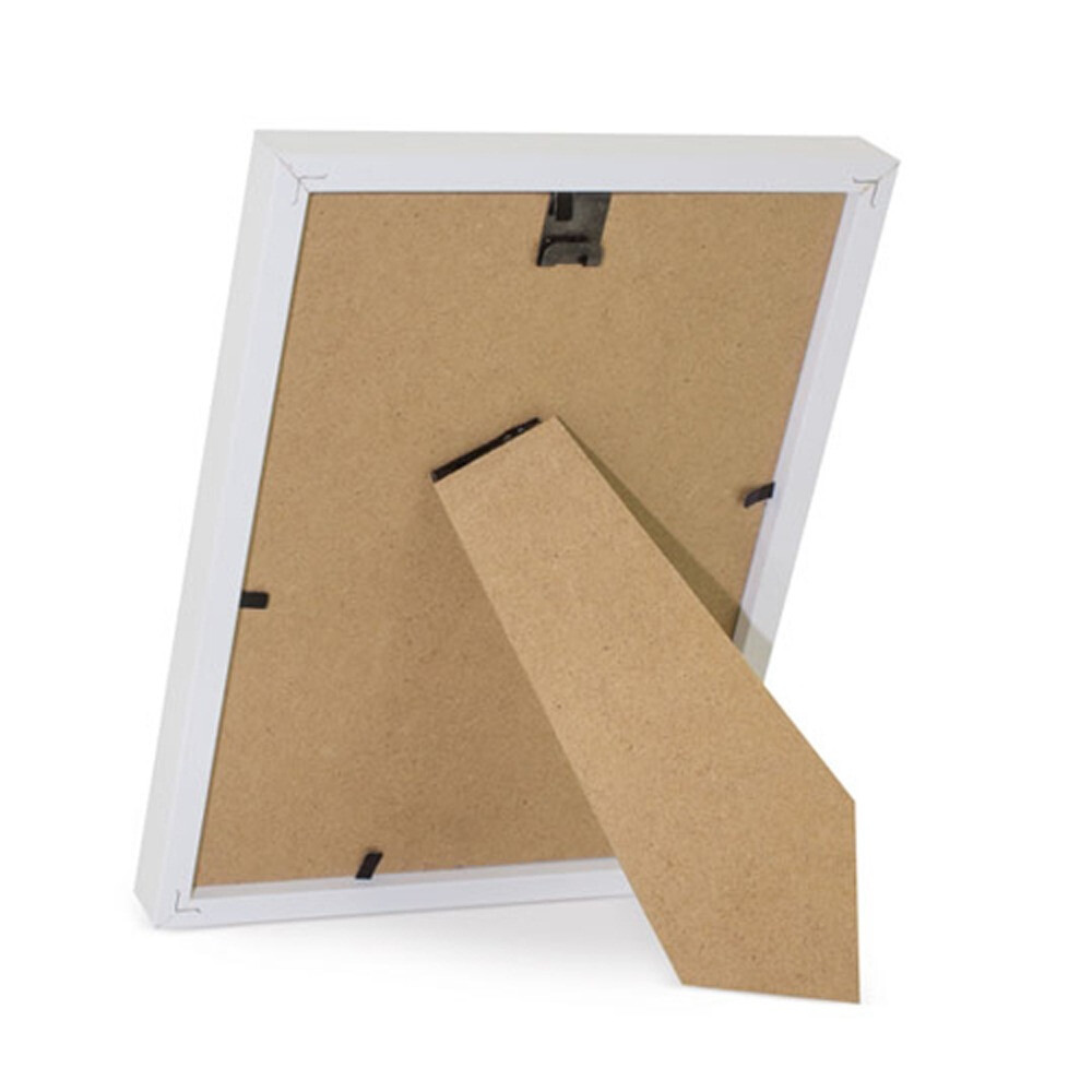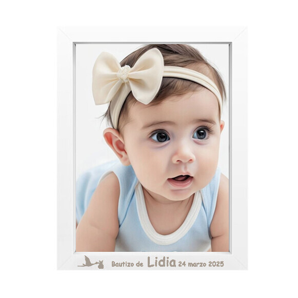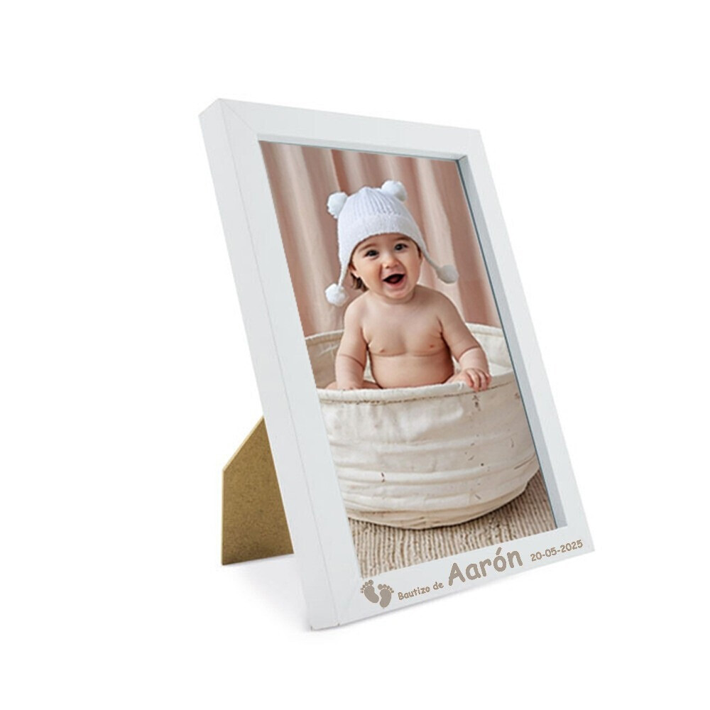 Portafotos de bautizo de madera en color blanco liso y cristal.