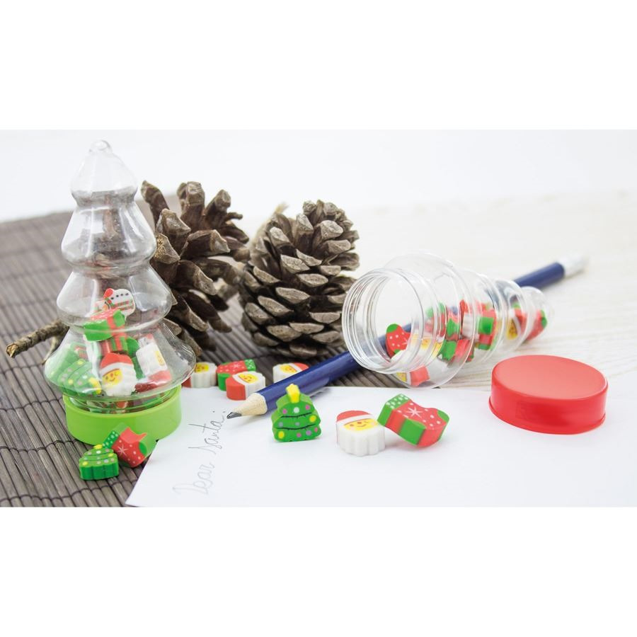 En su bote con forma de árbol de navidad con tapa en color rojo y verde encontrarás gomas de borrar con motivos navideños surtidos: Papá Noel, botas de navidad y árboles de navidad.