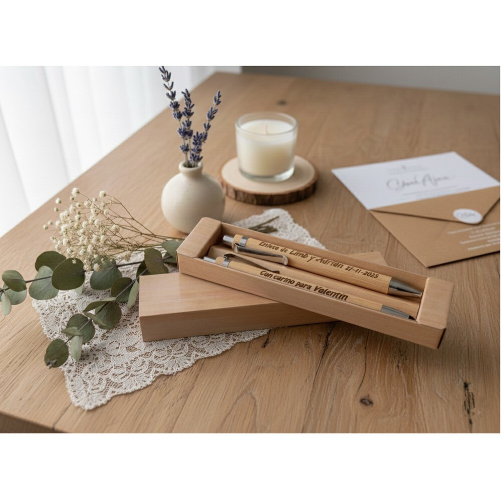 Original set de escritura compuesto por bolígrafo y portaminas presentado en un estuche de cartón con diseño de bambú a juego.