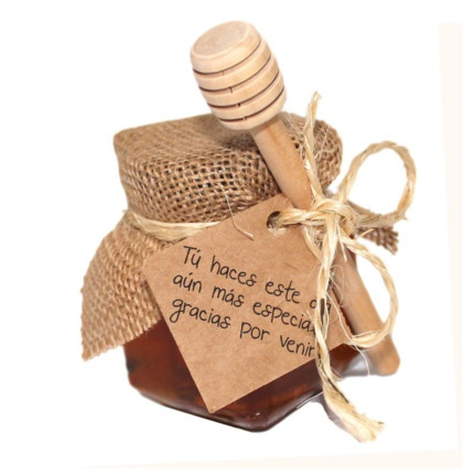 El tarrito de miel es redondo, con un diseño más moderno que va decorado con tela arpillera (tela de saco), un lazo con una tarjeta kraft con frase y se entrega montado listo para regalar. Si la eliges con pegatina diseñada, estas se envían sin pegar (al ser adhesivas se pegan facilmente en el producto una vez lo recibas)