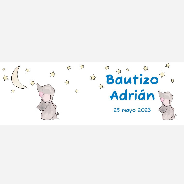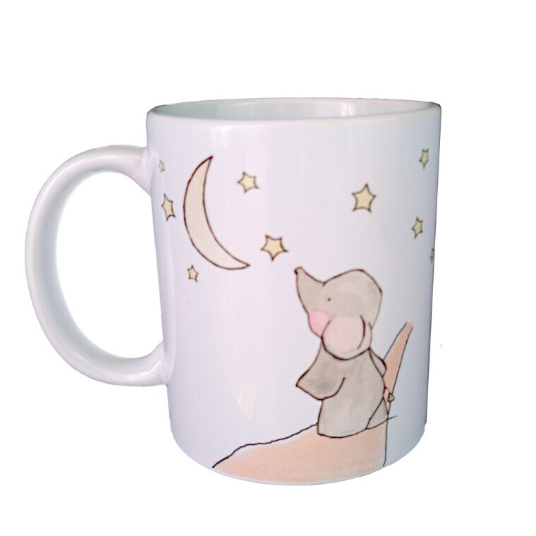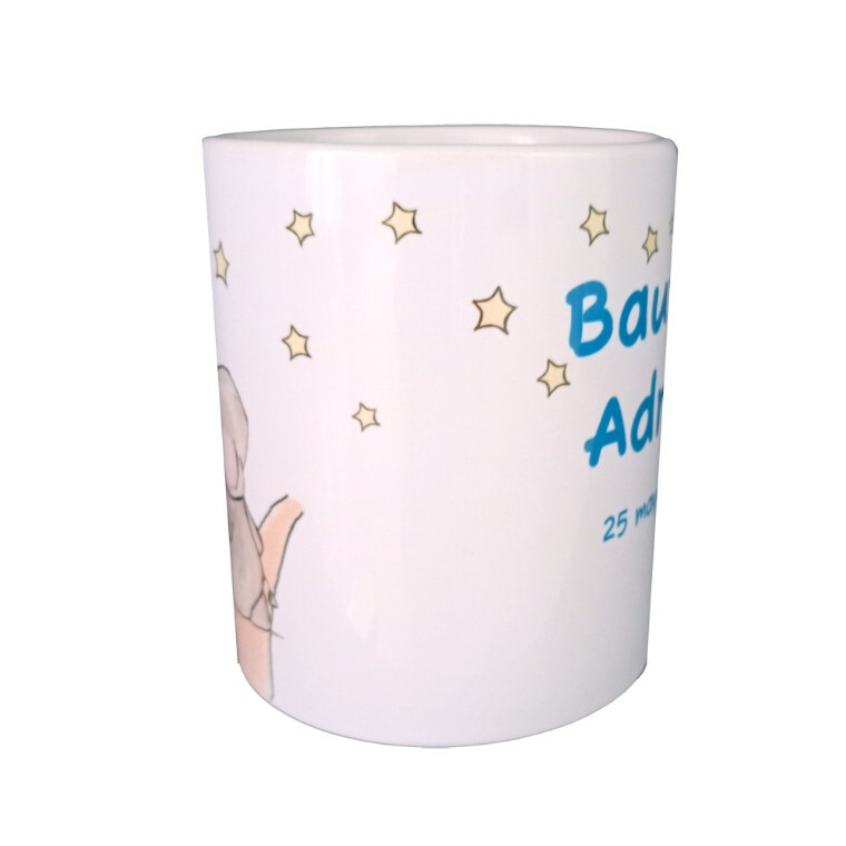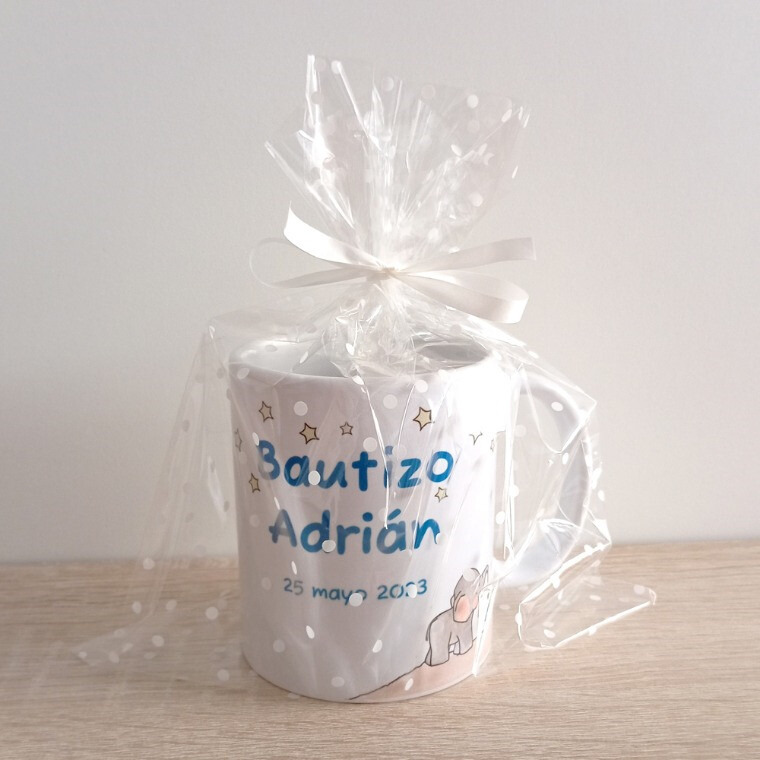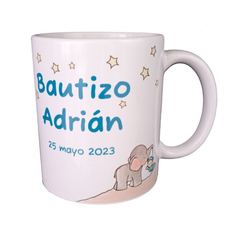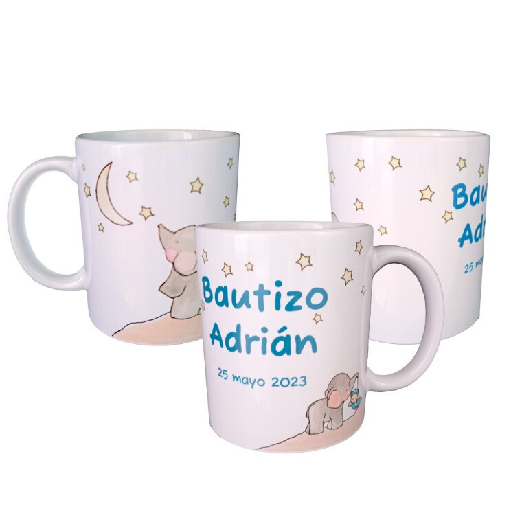 Taza de elefantes personalizada para bautizo de niña, con cielo de noche y estrellas.