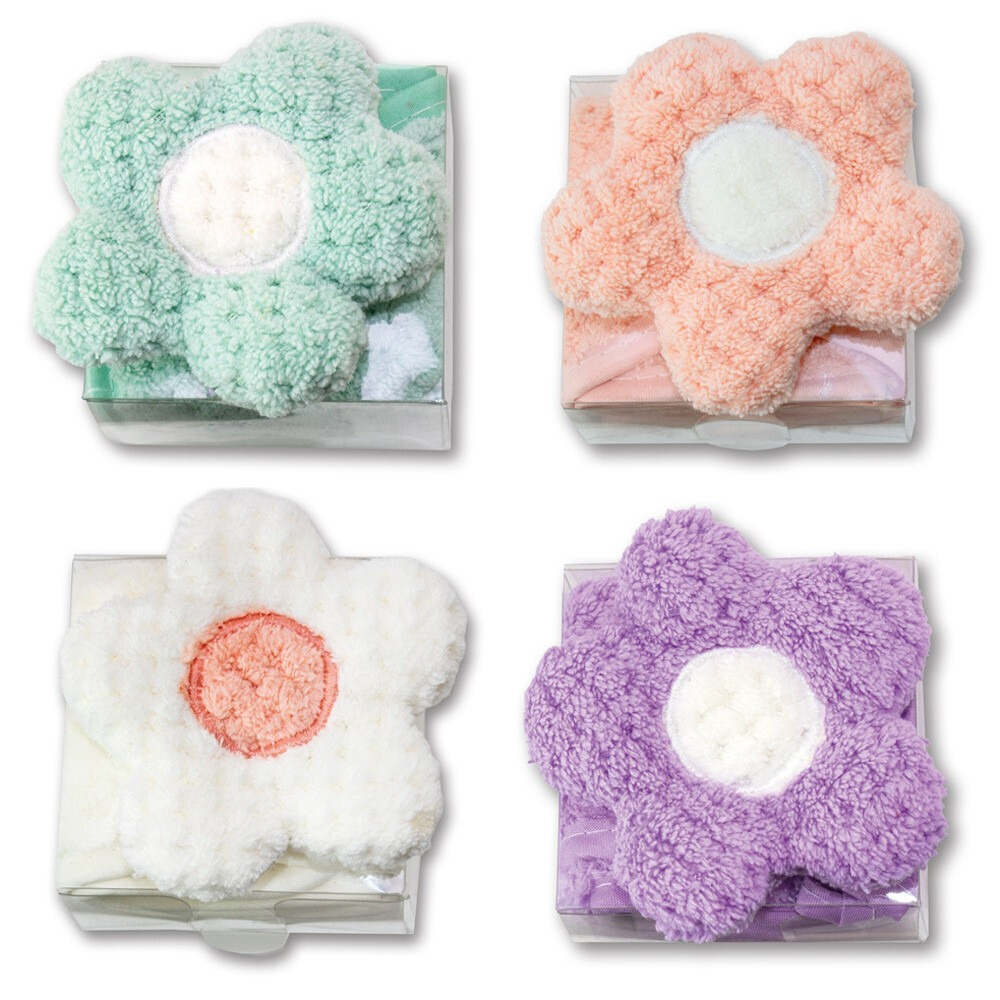 Se trata de una preciosa y suave toalla con una flor que viene presentada en una cajita transparente.