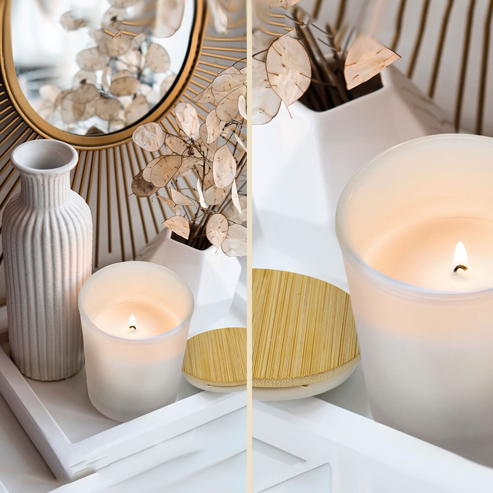Bonita vela aromática presentadas en un vaso de cristal esmerilado con tapa de bambú ideal para regalarla personalizada.