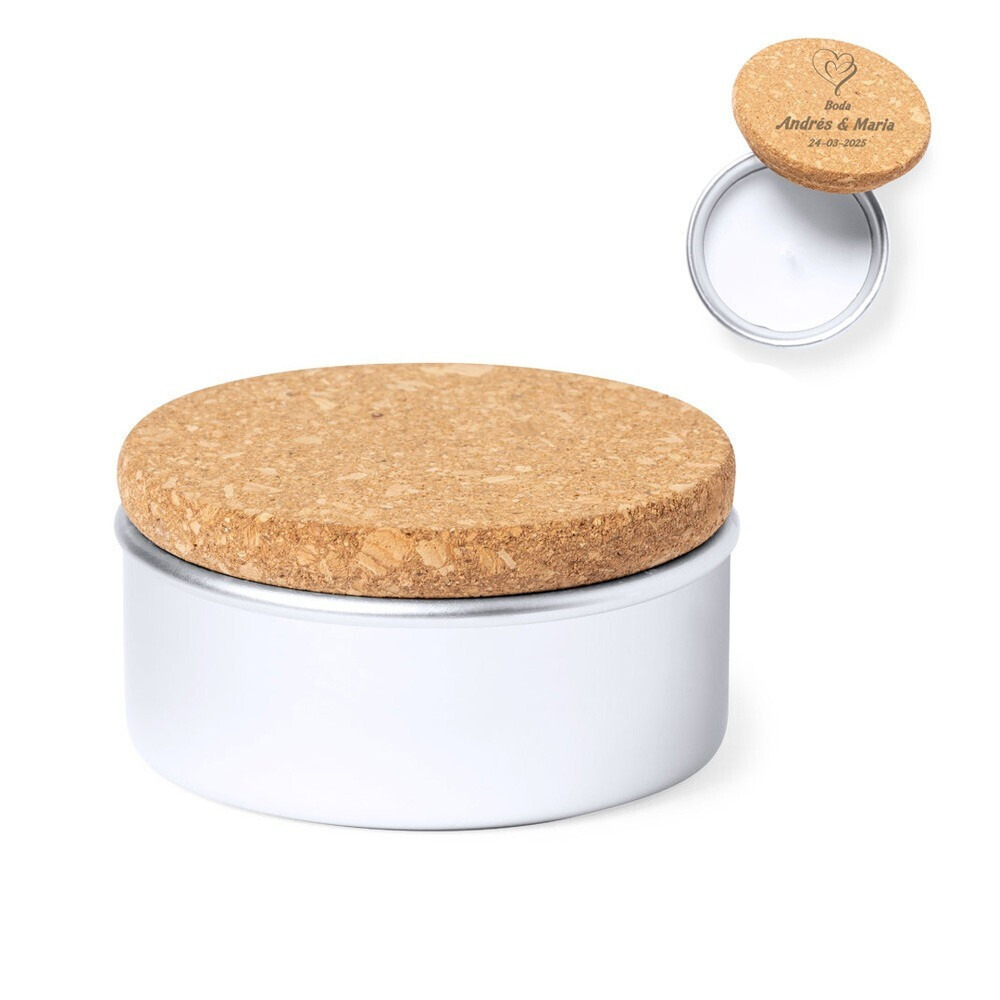 El tarrito de aluminio con tapón de corcho natural aporta un toque rústico y elegante, mientras que su presentación en caja kraft individual realza su encanto artesanal y sostenible.